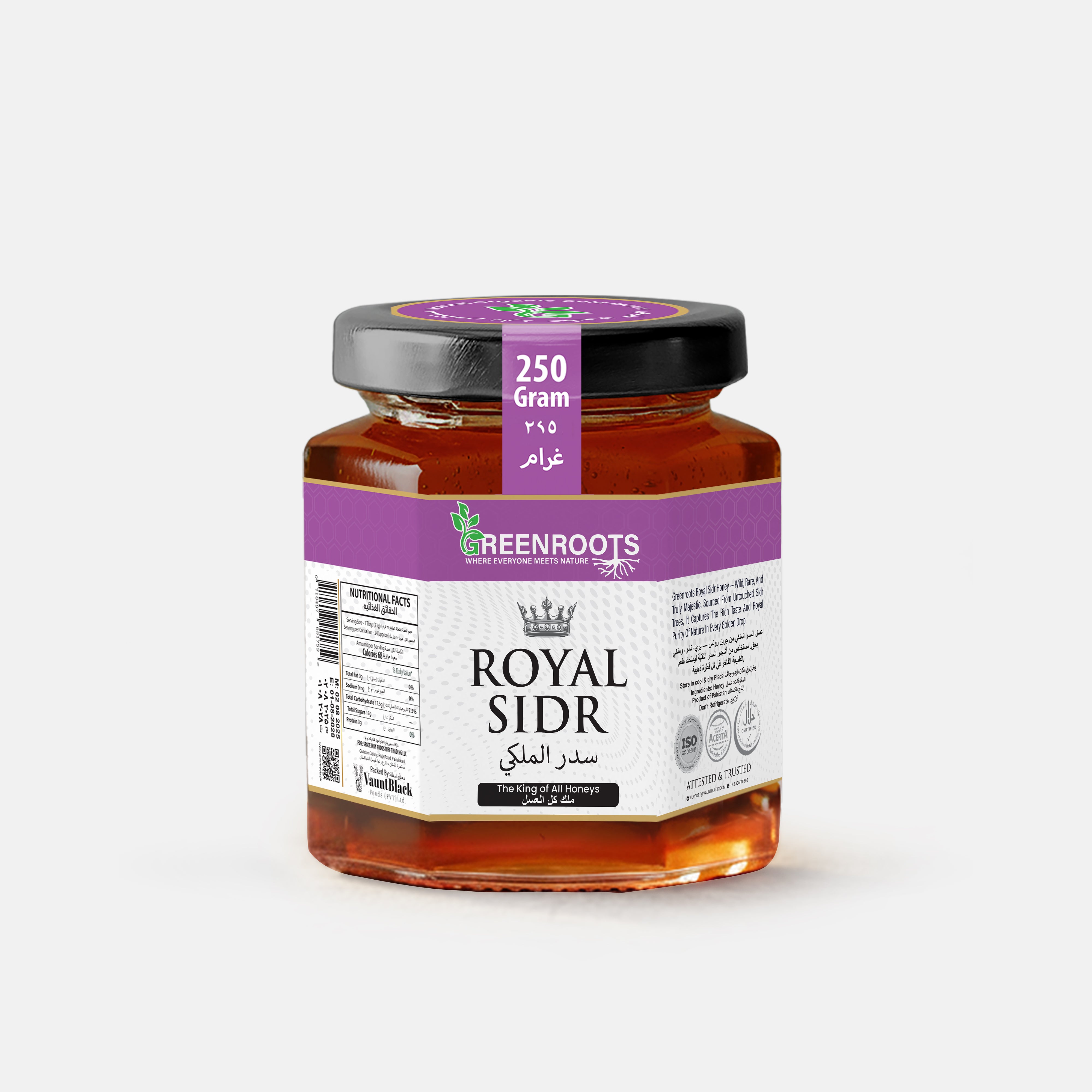 Greenroots Royal Sidr Honey is a rare and luxurious variety sourced from the final bloom of wild Sidr (Beri) trees growing in the untouched mountains of Pakistan and Afghanistan. Known as the “King of Kings” of honey, it is harvested during the last and richest flowering phase, when the nectar becomes thicker, darker, and more nutrientdense.